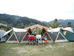 | 片添ケ浜の季節がやってきました。静かになった海辺のこのキャンプ場に、通い始めて早いもので3年。とても居心地のいいキャンプ場で、たくさんの思い出を頂きました。前置きはこのへんにして・・・雨です。天気予報では8日の午後は雨でした。ところが8日の朝降り出した雨は、止むこともなく降りつづき、山登りは中止。しかし、こんな時の為に、水着を持参。近くのリゾートホテルの温水プールへ。なんだか今日は結婚式があったらしく、集合写真を撮っている最中に、よれよれシャツにぞうり履きの集団が、ペッタペッタとロビーへ。雰囲気ぶち壊し!本当にすいませんでした。心から反省。そして迎えた最終日。雨はあがったものの、風がすごい。夜明け前に吹き出した風は、何組かのタープを倒し、朝釣りに行かれて無人になったテントをつぶしたり転がしたりと大暴れ。我が家もスノーピークアウトレットで買ったばかりのタープにダメージが・・・ショック。まあ、強度がわかってよかったかも。昼前には晴れ間も出て、テント・タープとも乾かせたので問題なし!! |