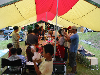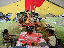 この天気ならとTSUMAMIさんのスーパーヘビータープをレクタの下に張ってみました。実はこれが本来の姿。真夏のたたらの森で考えた暑さ対策でした。結果は温度差が約2℃。みんなタープの下に来て涼しさを体感してました。正直びっくりしましたがこれからもテストしいい製品を作ってもらいたいものです。(笑)
