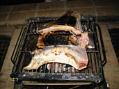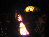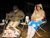 やってくれます、あしてんさん持参のマグロのカマ。ここは大トロ?って部分を焼いちゃいます。ホントうまいですよマグロは魚と言うより肉ですね。ご飯の後は焚火トーク。またまた沢山の焚火台が並びました。これも恒例の長い瞬き・・・なぜか隣に居るツッキーのほっぺが気になる私です。(写真をちっちゃくしたからわかんないだろうな) |