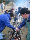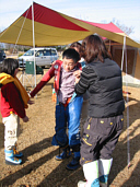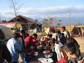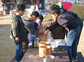 | お正月も近い?ってことで持ちつきもやっちゃいました。これって結構楽しいんだよ。プリムスの1合用臼でみんなが汗だくになってもちをつく。子供達も楽しそうに・・・早くつかないと冷えてかたくなるぞぉ〜!なんて誰も聞いてません。 |