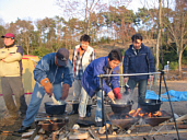 モリトさんを総監督に男のDOカレー。ダッチオーブンを6個使いそれぞれに味を変えた絶品カレー。男のって言うぐらいだから材料を切るところから最終工程まですべてが男だけの作業。みんな仲良く炊事棟に並んで皮をむぎ玉ねぎを涙しながら切ってる姿はなかなのものです。それらは個性的なカッティングで食材をDOに入れる時にウケルのなんの。ジャガイモ担当としてはウケル事を忘れ、いつものようにまじめに丁寧に作業したもんだから今思えばちょっと失敗。唯一の反省点です。(笑) |