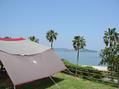昨日のうちに準備は済んでいるので7:30には自宅を出発、途中渋滞はないものの島に渡ると超安全運転の軽トラックが沢山、さすが高齢者の町。スピード違反で捕まることもなくそんなこんなでキャンプ場には9:15に到着。設営してまずはプハー。そして海岸へ散歩に行くとそこはパラダイス。この喜びは共有しなければと・・・しかし時すでに遅しでした。 |