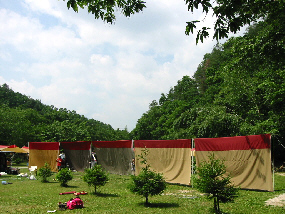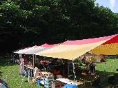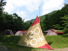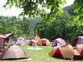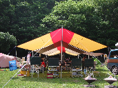 今日は有給休暇。信じられないくらい早くから休暇申請し仕事を入れないように調整。心配されていた天気も今日が近づくごとに雨マークは消えていき雲ひとつない・・・少しはあったが快晴。子供達を早退させていざ大鬼谷へ!今回はレクタ5連結の長屋の住人に加えていただきました。張られたタープはすべて年代も違えば色も違うそんないろいろなタープをセンターに配置しその両側にテントを配置しました。なかなか素敵なグループサイトとなりました。この場所だったから出来た事ですね。夜は前夜祭の焚火トーク。久々の再会やお初にお目にかかる人、スタッフなどとの楽しいトークであっと言う間に夜はふけていきました。 |