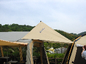 → 今回は小川キャンパルのシェルターUとユニフレームのエアスクリーンとの連結について考えてみました。エアスクリーンのフラップをセンターをポールで立ち上げて両サイドをシェルターUのフラップを巻き上げた時にとめておく時のわっかに引っ掛けます。風のないときには有効でした。(マウスオーバー)