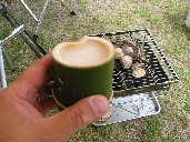 → 搾りたての日本酒です。ぐい飲みはキャンプ場の屋根より低い鯉のぼりを、屋根より高くした時にあまった竹を利用して作りました。そして焼きハマグリ。スノーピークの焚火台Sが妙に具合がいいんですよ。あれはだらだら呑むときには最高ですね。あさけで好評だったししゃもの本乾もあぶって、あぁ〜旨い! |