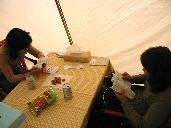 ← これ5月2日のサイトから見た風景。マウスオーバーすると次の日。やはり今年も風が吹きました。「メイストーム」。去年と一昨年は連休なか日の平日だった為、ほとんどキャンパーはいなかったんだけど今年はやばいよ多すぎる。管理人さんから天気状況を聞き、Yahoo!モバイルで天気図や天気概況を頻繁に確認しながら大雨・雷・洪水・強風・波浪・ets一通りの警報&注意報が出た時は一瞬考えたけど3日の午前中にはペグダウンと車で風よけなど風対策は完了。事前に管理棟で本を借り温泉にも入って準備OK。予報通り14時を過ぎたころからやってきました強風が。シェルターの中にこもり本を読んだりしてたんですがみんなかなりびびってる。よく考えたら私以外はこの風の経験がないんでした。そう言えばなか日はいつも一人でした。 |