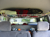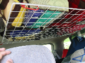 今回は車内がすっきり。あしてんさんに教わった車内吊り棚を実践してみました。ハイルーフじゃないからスペースは限られますが、後方視界をまったく遮ることなく絶妙な高さ。そこには100均で見つけた収納袋シリーズの10番を使い車から降ろす必要のないレインウエアや防寒着を収めました。