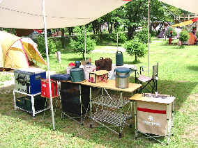 で、今回の装備。おやじ1人と足の臭い子供2人と3人での参加。1泊しかできない事もあり料理も超手抜き。簡単に言えば包丁を使わない、そうコンビニキャンプ。1泊だし行った日の昼、夜、翌日の朝、昼の4食+酒の肴。今回はサーマルクッカーに働いてもらい温めれば出来上がる料理がメイン。買い物は前の日の夜に24時間スーパーへ。野菜も食べなければってことで行きがけにコンビニでサラダを仕入れついでに酒の肴なども追加。 |  |