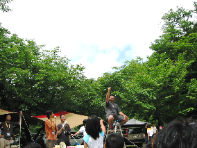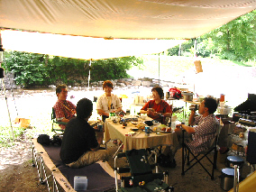 → 8:30には到着しみんなの手伝いであっと言う間に設営完了。速攻で丸テーブルを囲んで飲むわ飲むわ。止める人もいないしどんどん酒の肴は出てくるし・・・・ |