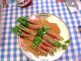 → ルッコラの生ハムまき。あしてんさんがなんか作ってるなぁと思ったらこれ。ルッコラはゴマの香りのするハーブ。うまかった。他にもビスケットにゆで卵とマヨネーズをちょっとになんとキャビアをのせた酒の肴が・・・・・これまたうまかったぁ。