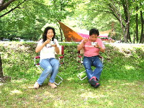 ← れんぱぱ&ごんちゃんサイトでまったりトーク。川のほとりのサイト。林間でもあり涼しい風が吹き抜けていく。