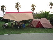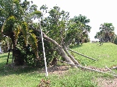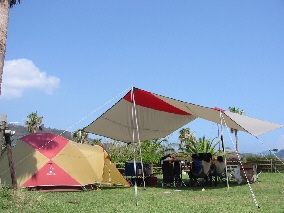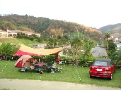 | 当日の朝、ちょうど出発する時間の広島は豪雨。100%雨設営を覚悟していたが山口に入ると雨が降った形跡はなし!玖珂ICをノンストップで通過。そうETCつけちゃいました。前日が車検でそのついでにお願いしたんですがいろんな事情で車が帰ってきたのが夜の9時前。それからの積み込みはかなり疲れました。IC自体がまったく混んでないのであんまりメリットは感じなかったんですけどね。そして現地に近づくにつれ先日の台風の影響が・・・・屋根にはブルーシート、電柱は傾き、倒木や割れた竹、そりゃぁ凄かった。キャンプ場についてまたビックリ!炊事等の屋根は飛び木は折れ・・・きっと観測施設があれば広島より凄かったと思われます。 |  |