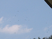 → この写真。黒い点がわかりますか?実はカラスなんです。夏に生ごみがごみ処分場所からあふれ、またマナーの悪いキャンパーが分別せずに出したりでカラスが楽に餌を取る方法を学習したようです。サイトに下りてくることはないのですが山から山へ集団で移動しています。なんとか対策を考えてもらわないとね。 |